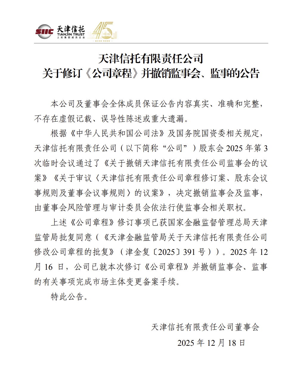 天津信托有限責(zé)任公司關(guān)于修改《公司章程》并撤銷監(jiān)事會(huì)、監(jiān)事的公告