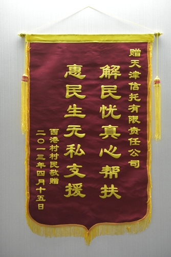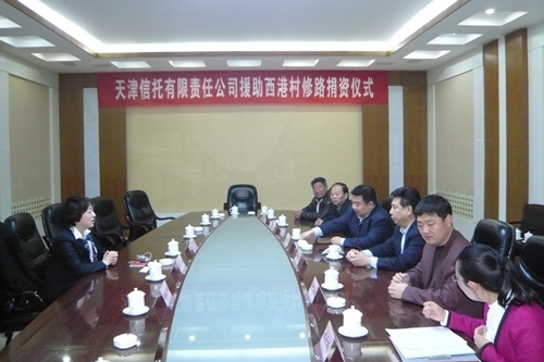 天津信托有限責(zé)任公司響應(yīng)市文明辦號(hào)召,與靜??h西港村開(kāi)展精神文明“雙百共建”活動(dòng),公司出資30萬(wàn)元援助西港村村街建設(shè)。為了真正給西港村提供實(shí)實(shí)在在的幫助,公司與村黨支部多次溝通了解需求,并進(jìn)行實(shí)地考察確定援助項(xiàng)目,為保證做到資金??顚S?,靜??h委宣傳部、沿莊鎮(zhèn)黨委、西港村和公司四方簽訂項(xiàng)目實(shí)施方案,明確工程招標(biāo)、施工監(jiān)督、資金保障等四方的權(quán)利和義務(wù),保證了資金及時(shí)到位和專款專用。圖為援助項(xiàng)目實(shí)施方案簽字儀式和西港村村民代表送的錦旗。